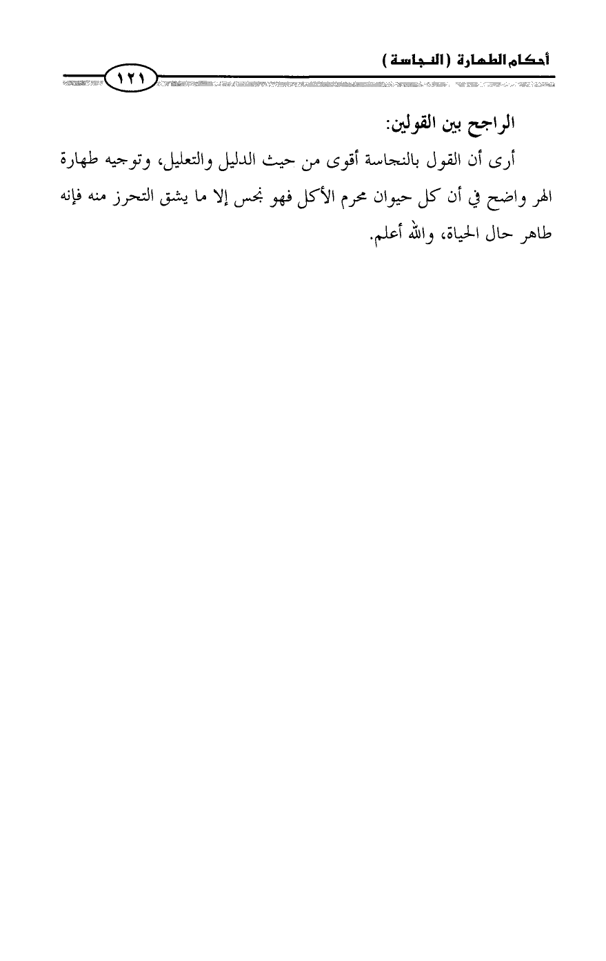 أرى أن القول بالنجاسة أقوى من حيث الدليل والتعليل، وتوجيه طهارة الهر واضح في أن كل حيوان محرم الأكل فهو نجس إلا ما يشق التحرز منه فإنه طاهر حال الحياة، والله أعلم.