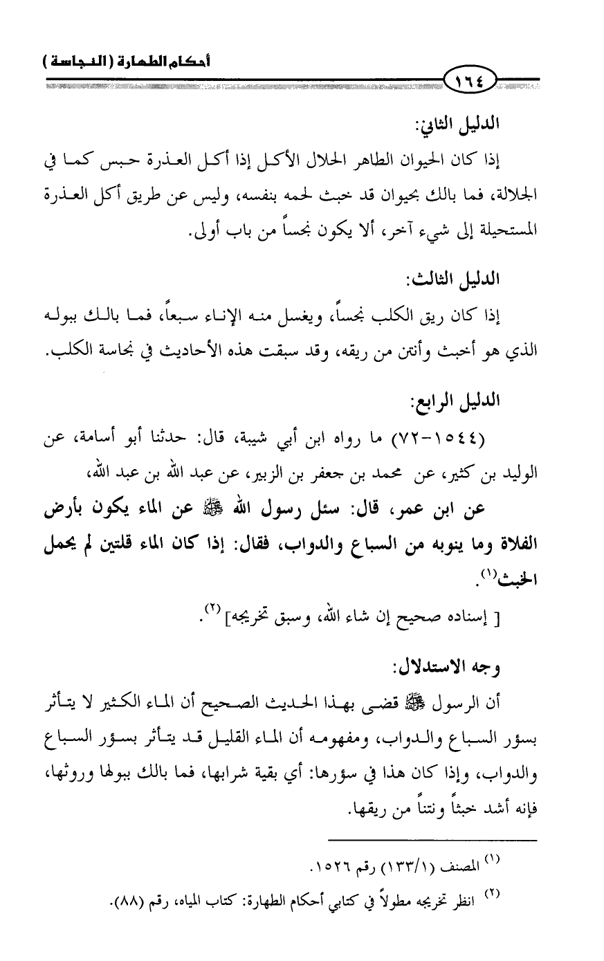 أن الرسول - صلى الله عليه وسلم - قضى بهذا الحديث الصحيح أن الماء الكثير لا يتأثر بسؤر السباع والدواب، ومفهومه أن الماء القليل قد يتأثر بسؤر السباع والدواب، وإذا كان هذا في سؤرها: أي بقية شرابها، فما بالك ببولها وروثها، فإنه أشد خبثاً ونتناً من ريقها.