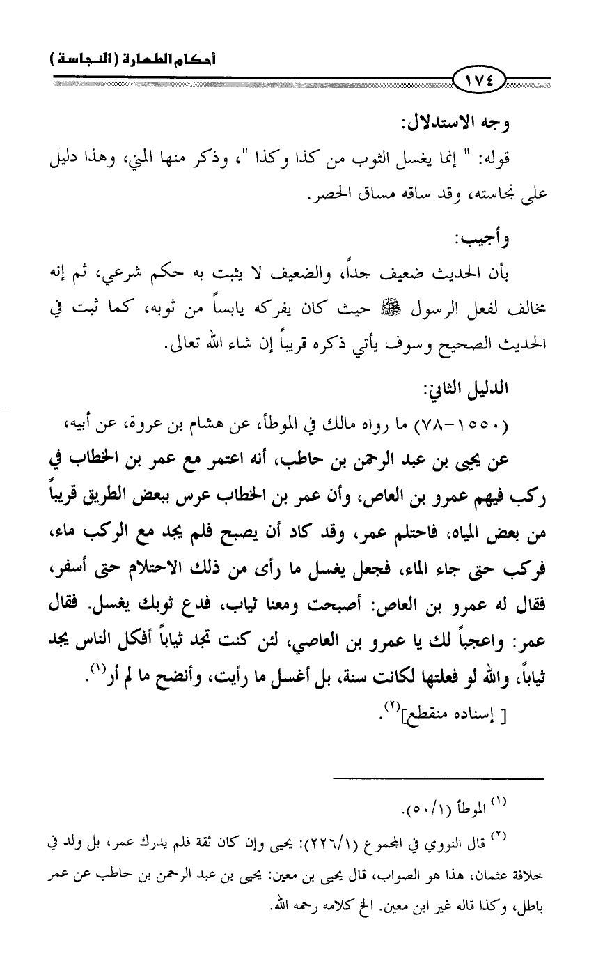 عن يحيى بن عبد الرحمن بن حاطب، أنه اعتمر مع عمر بن الخطاب في ركب فيهم عمرو بن العاص، وأن عمر بن الخطاب عرس ببعض الطريق قريباً من بعض المياه، فاحتلم عمر، وقد كاد أن يصبح فلم يجد مع الركب ماء، فركب حتى جاء الماء، فجعل يغسل ما رأى من ذلك الاحتلام حتى أسفر، فقال له عمرو بن العاص: أصبحت ومعنا ثياب، فدع ثوبك يغسل. فقال عمر: واعجباً لك يا عمرو بن العاصي، لئن كنت تجد ثياباً أفكل الناس يجد ثياباً، والله لو فعلتها لكانت سنة، بل أغسل ما رأيت، وأنضح ما لم أر (¬١).