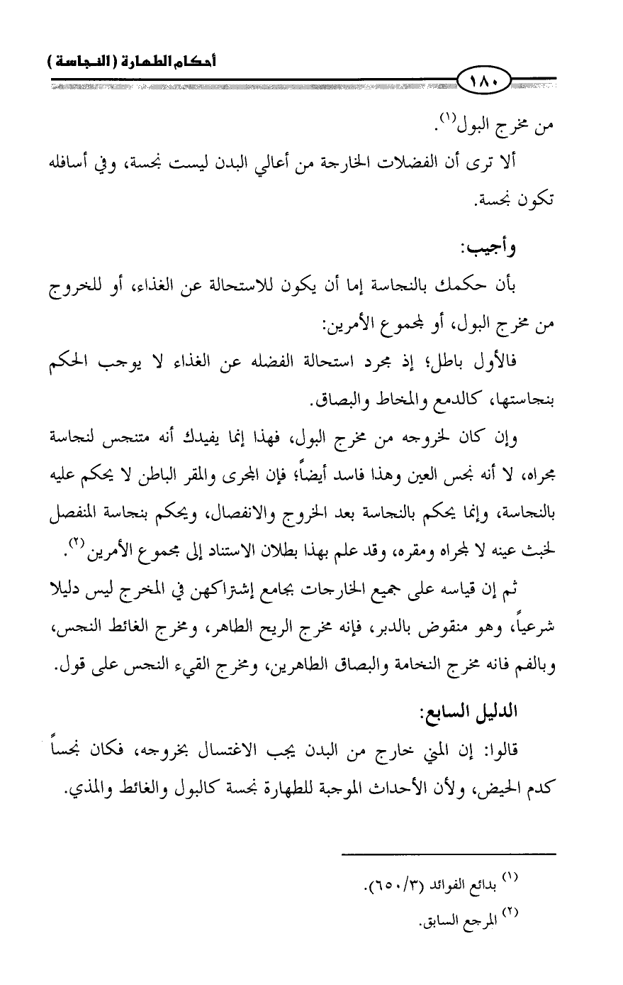 ثم إن قياسه على جميع الخارجات بجامع إشتراكهن في المخرج ليس دليلا شرعياً، وهو منقوض بالدبر، فإنه مخرج الريح الطاهر، ومخرج الغائط النجس، وبالفم فانه مخرج النخامة والبصاق الطاهرين، ومخرج القيء النجس على قول.