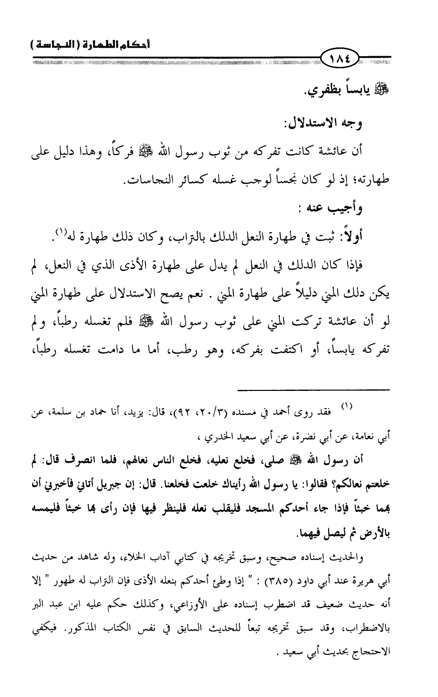 فإذا كان الدلك في النعل لم يدل على طهارة الأذى الذي في النعل، لم يكن دلك المني دليلاً على طهارة المني. نعم يصح الاستدلال على طهارة المني لو أن عائشة تركت المني على ثوب رسول الله - صلى الله عليه وسلم - فلم تغسله رطباً، ولم تفركه يابساً، أو اكتفت بفركه، وهو رطب، أما ما دامت تغسله رطباً،