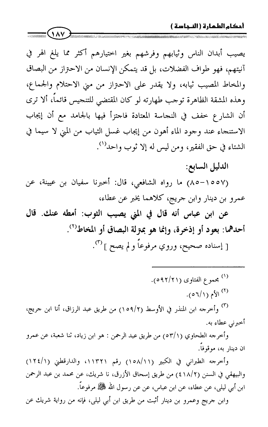 يصيب أبدان الناس وثيابهم وفرشهم بغير اختيارهم أكثر مما يلغ الهر في آنيتهم، فهو طواف الفضلات، بل قد يتمكن الإنسان من الاحتراز من البصاق والمخاط المصيب ثيابه، ولا يقدر على الاحتراز من مني الاحتلام والجماع، وهذه المشقة الظاهرة توجب طهارته لو كان المقتضي للتنجيس قائماً، ألا ترى أن الشارع خفف في النجاسة المعتادة فاجتزأ فيها بالجامد مع أن إيجاب الاستنجاء عند وجود الماء أهون من إيجاب غسل الثياب من المني لا سيما في الشتاء في حق الفقير، ومن ليس له إلا ثوب واحد (¬١).