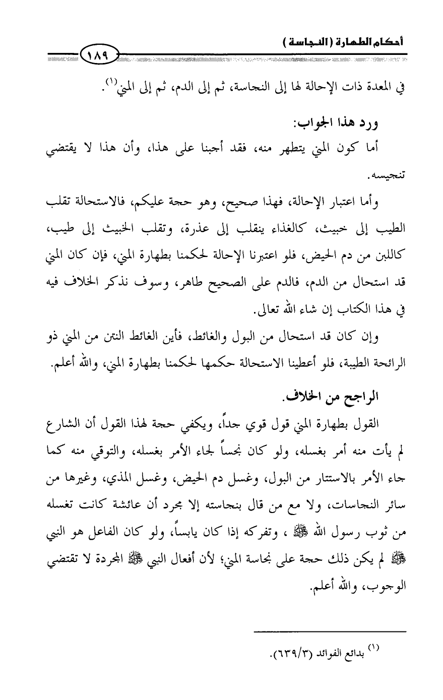 وأما اعتبار الإحالة، فهذا صحيح، وهو حجة عليكم، فالاستحالة تقلب الطيب إلى خبيث، كالغذاء ينقلب إلى عذرة، وتقلب الخبيث إلى طيب، كاللبن من دم الحيض، فلو اعتبرنا الإحالة لحكمنا بطهارة المني، فإن كان المني قد استحال من الدم، فالدم على الصحيح طاهر، وسوف نذكر الخلاف فيه في هذا الكتاب إن شاء الله تعالى.