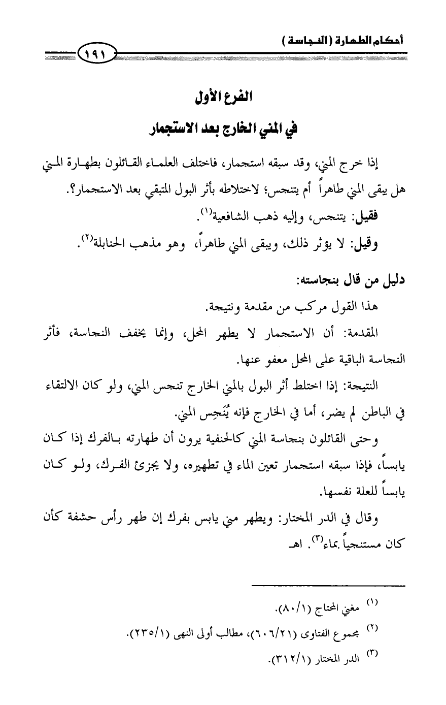 وحتى القائلون بنجاسة المني كالحنفية يرون أن طهارته بالفرك إذا كان يابساً، فإذا سبقه استجمار تعين الماء في تطهيره، ولا يجزئ الفرك، ولو كان يابساً للعلة نفسها.