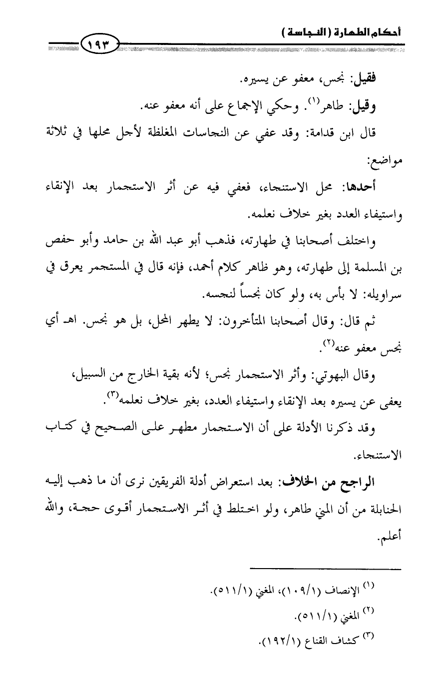 وقال البهوتي: وأثر الاستجمار نجس؛ لأنه بقية الخارج من السبيل، يعفى عن يسيره بعد الإنقاء واستيفاء العدد، بغير خلاف نعلمه (¬٣).