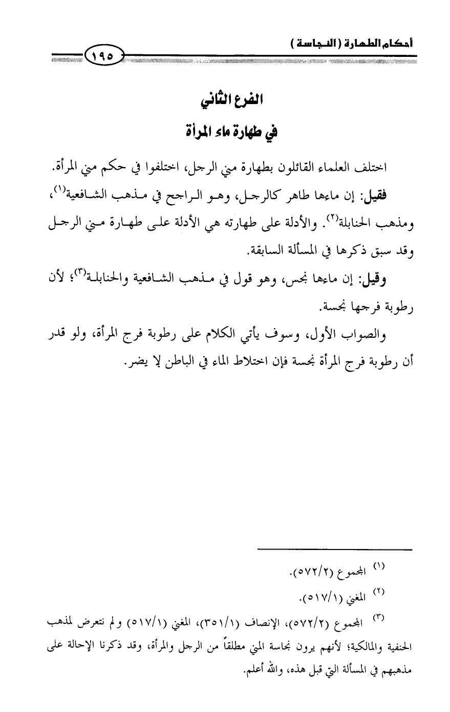 (¬٣) المجموع (٢/ ٥٧٢)، الإنصاف (١/ ٣٥١)، المغني (١/ ٥١٧) ولم نتعرض لمذهب الحنفية والمالكية؛ لأنهم يرون نجاسة المني مطلقاً من الرجل والمرأة، وقد ذكرنا الإحالة على مذهبهم في المسألة التي قبل هذه، والله أعلم.