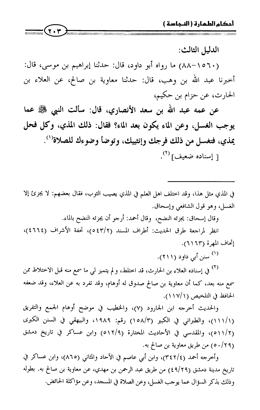 (١٥٦٠ - ٨٨) ما رواه أبو داود، قال: حدثنا إبراهيم بن موسى، قال: أخبرنا عبد الله بن وهب، قال: حدثنا معاوية بن صالح، عن العلاء بن الحارث، عن حزام بن حكيم،