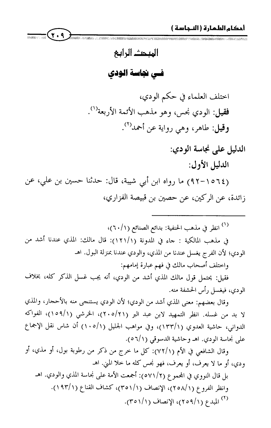 وقال بعضهم: معنى المذي أشد من الودي؛ لأن الودي يستنجى منه بالأحجار، والمذي لا بد من غسله. انظر التمهيد لابن عبد البر (٢١/ ٢٠٥)، الخرشي (١/ ١٥٩)، الفواكه الدواني، حاشية العدوي (١/ ١٣٣)، وفي مواهب الجليل (١/ ١٠٥) أن شاس نقل الإجماع على نجاسة الودي. اهـ وحاشية الدسوقي (١/ ٥٦).