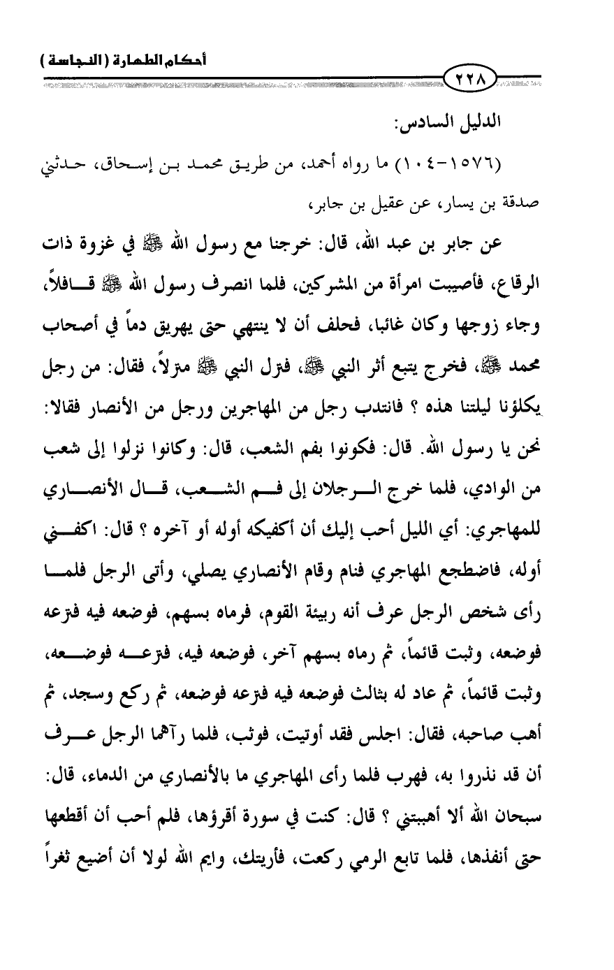 عن جابر بن عبد الله، قال: خرجنا مع رسول الله - صلى الله عليه وسلم - في غزوة ذات الرقاع، فأصيبت امرأة من المشركين، فلما انصرف رسول الله - صلى الله عليه وسلم - قافلاً، وجاء زوجها وكان غائبا، فحلف أن لا ينتهي حتى يهريق دماً في أصحاب محمد - صلى الله عليه وسلم -، فخرج يتبع أثر النبي - صلى الله عليه وسلم -، فنزل النبي - صلى الله عليه وسلم - منزلاً، فقال: من رجل يكلؤنا ليلتنا هذه؟ فانتدب رجل من المهاجرين ورجل من الأنصار فقالا: نحن يا رسول الله. قال: فكونوا بفم الشعب، قال: وكانوا نزلوا إلى شعب من الوادي، فلما خرج الرجلان إلى فم الشعب، قال الأنصاري للمهاجري: أي الليل أحب إليك أن أكفيكه أوله أو آخره؟ قال: اكفني أوله، فاضطجع المهاجري فنام وقام الأنصاري يصلي، وأتى الرجل فلما رأى شخص الرجل عرف أنه ربيئة القوم، فرماه بسهم، فوضعه فيه فنزعه فوضعه، وثبت قائماً، ثم رماه بسهم آخر، فوضعه فيه، فنزعه فوضعه، وثبت قائماً، ثم عاد له بثالث فوضعه فيه فنزعه فوضعه، ثم ركع وسجد، ثم أهب صاحبه، فقال: اجلس فقد أوتيت، فوثب، فلما رآهما الرجل عرف أن قد نذروا به، فهرب فلما رأى المهاجري ما بالأنصاري من الدماء، قال: سبحان الله ألا أهببتني؟ قال: كنت في سورة أقرؤها، فلم أحب أن أقطعها حتى أنفذها، فلما تابع الرمي ركعت، فأريتك، وايم الله لولا أن أضيع ثغراً