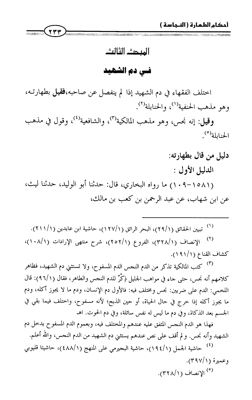 (¬٣) كتب المالكية تذكر من الدم النجس الدم المسفوح، ولا تستثني دم الشهيد، فظاهر كلامهم أنه نجس، حتى جاء في مواهب الجليل ذِكْرٌ للدم النجس والطاهر، فقال (١/ ٩٦): قال اللخمي: الدم على ضربين: نجس ومختلف فيه: فالأول دم الإنسان، ودم ما لا يجوز أكله، ودم ما يجوز أكله إذا خرج في حال الحياة، أو حين الذبح؛ لأنه مسفوح، واختلف فيما بقي في الجسم بعد الذكاة، وفي دم ما ليس له نفس سائلة، وفي دم الحوت. اهـ