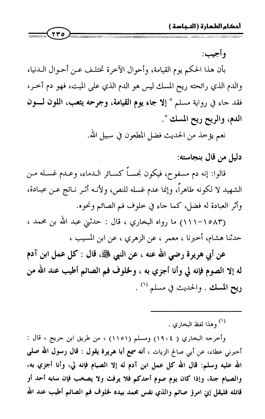 قالوا: إنه دم مسفوح، فيكون نجساً كسائر الدماء، وعدم غسله من الشهيد لا لكونه طاهراً، وإنما عدم غسله للنص، ولأنه أثر ناتج عن عبادة، وأثر العبادة له فضل، كما جاء في خلوف فم الصائم ونحوه.