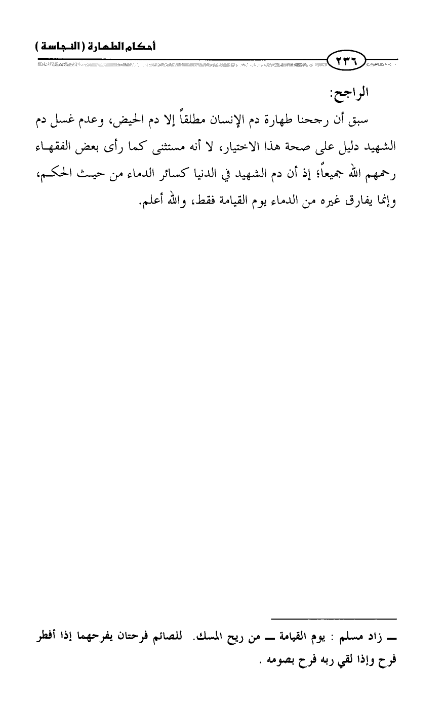 سبق أن رجحنا طهارة دم الإنسان مطلقاً إلا دم الحيض، وعدم غسل دم الشهيد دليل على صحة هذا الاختيار، لا أنه مستثنى كما رأى بعض الفقهاء رحمهم الله جميعاً؛ إذ أن دم الشهيد في الدنيا كسائر الدماء من حيث الحكم، وإنما يفارق غيره من الدماء يوم القيامة فقط، والله أعلم.