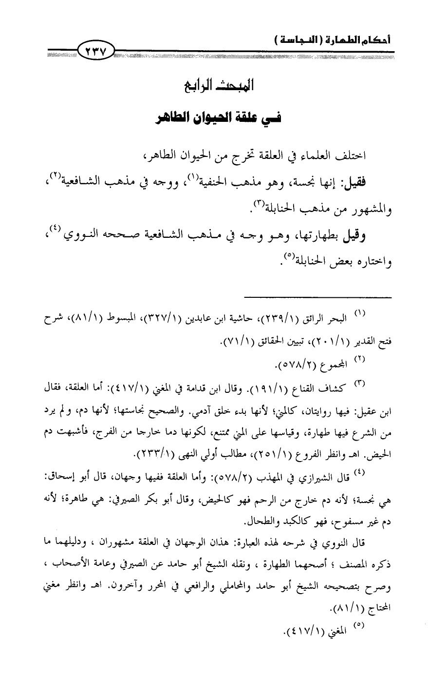 (¬٣) كشاف القناع (١/ ١٩١). وقال ابن قدامة في المغني (١/ ٤١٧): أما العلقة, فقال ابن عقيل: فيها روايتان, كالمني; لأنها بدء خلق آدمي. والصحيح نجاستها; لأنها دم, ولم يرد من الشرع فيها طهارة, وقياسها على المني ممتنع, لكونها دما خارجا من الفرج, فأشبهت دم الحيض. اهـ وانظر الفروع (١/ ٢٥١)، مطالب أولي النهى (١/ ٢٣٣).