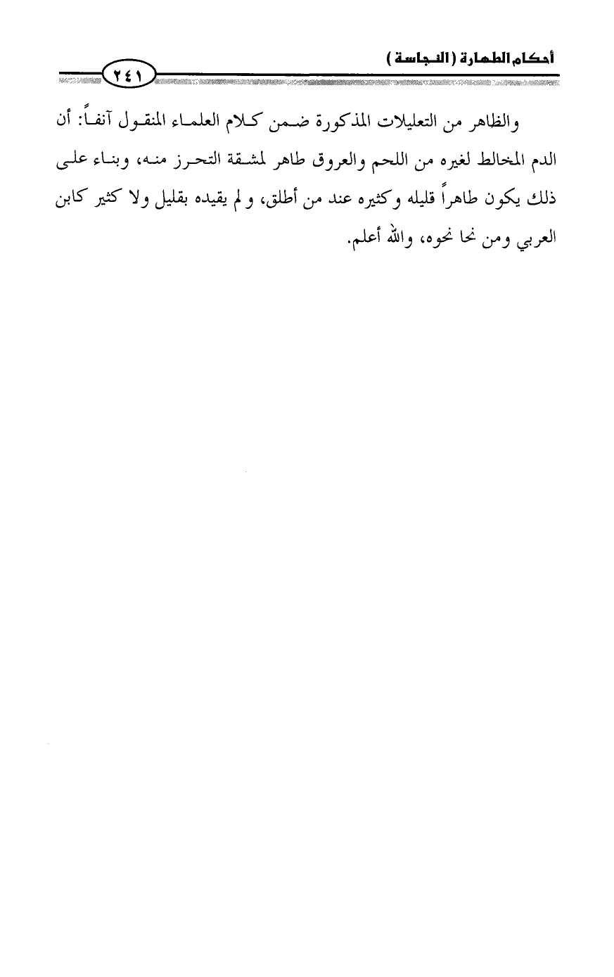 والظاهر من التعليلات المذكورة ضمن كلام العلماء المنقول آنفاً: أن الدم المخالط لغيره من اللحم والعروق طاهر لمشقة التحرز منه، وبناء على ذلك يكون طاهراً قليله وكثيره عند من أطلق، ولم يقيده بقليل ولا كثير كابن العربي ومن نحا نحوه، والله أعلم.
