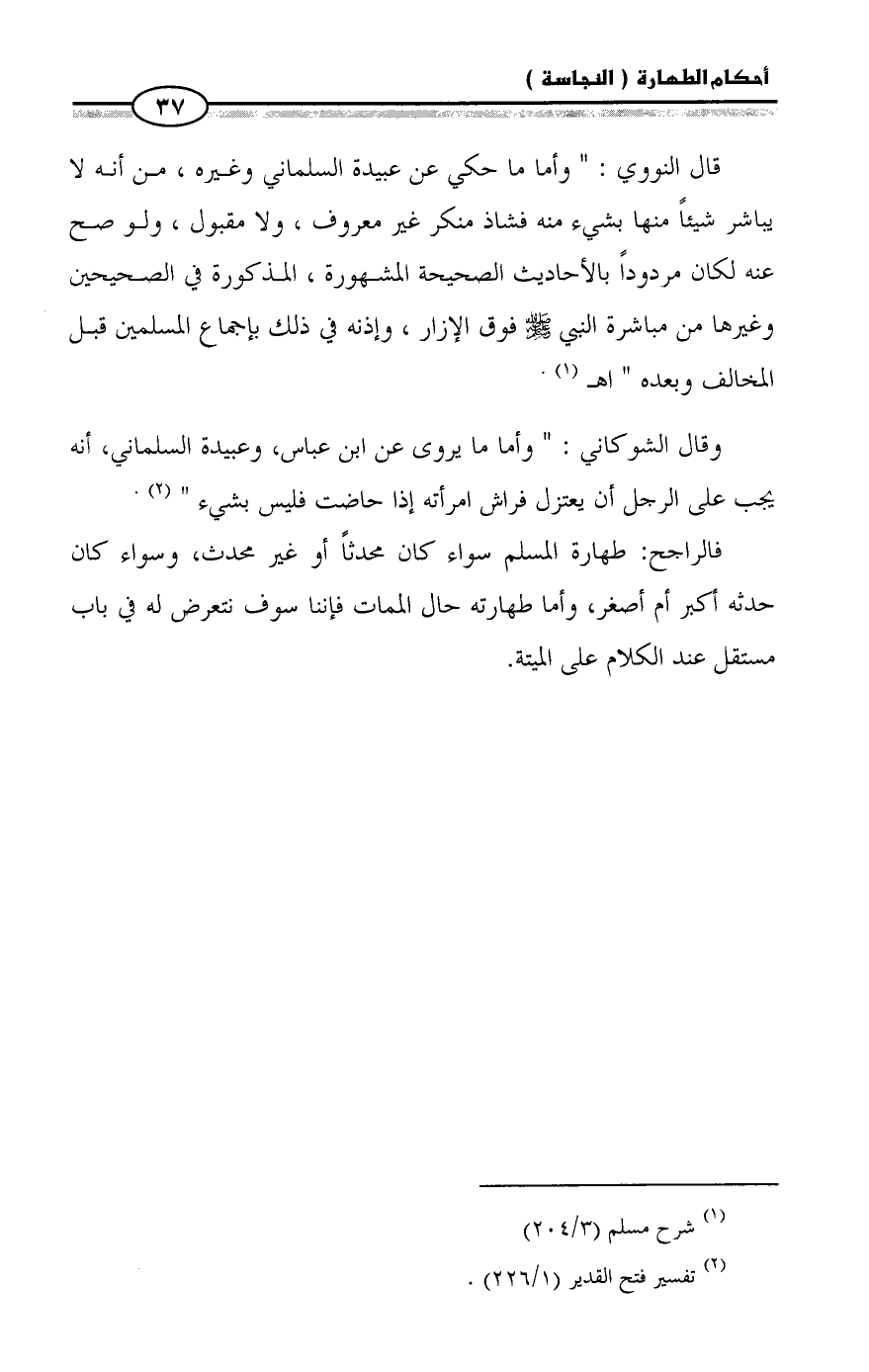 قال النووي: " وأما ما حكي عن عبيدة السلماني وغيره، من أنه لا يباشر شيئاً منها بشيء منه فشاذ منكر غير معروف، ولا مقبول، ولو صح عنه لكان مردوداً بالأحاديث الصحيحة المشهورة، المذكورة في الصحيحين وغيرها من مباشرة النبي - صلى الله عليه وسلم - فوق الإزار، وإذنه في ذلك بإجماع المسلمين قبل المخالف وبعده " اهـ (¬١).