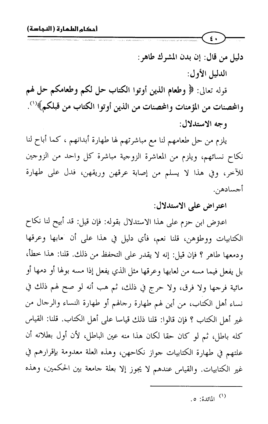 اعترض ابن حزم على هذا الاستدلال بقوله: فإن قيل: قد أبيح لنا نكاح الكتابيات ووطؤهن, قلنا نعم, فأي دليل في هذا على أن لعابها وعرقها ودمعها طاهر؟ فإن قيل: إنه لا يقدر على التحفظ من ذلك. قلنا: هذا خطأ, بل يفعل فيما مسه من لعابها وعرقها مثل الذي يفعل إذا مسه بولها أو دمها أو مائية فرجها ولا فرق, ولا حرج في ذلك, ثم هب أنه لو صح لهم ذلك في نساء أهل الكتاب, من أين لهم طهارة رجالهم أو طهارة النساء والرجال من غير أهل الكتاب؟ فإن قالوا: قلنا ذلك قياسا على أهل الكتاب. قلنا: القياس كله باطل, ثم لو كان حقا لكان هذا منه عين الباطل, لأن أول بطلانه أن علتهم في طهارة الكتابيات جواز نكاحهن, وهذه العلة معدومة بإقرارهم في غير الكتابيات. والقياس عندهم لا يجوز إلا بعلة جامعة بين الحكمين, وهذه