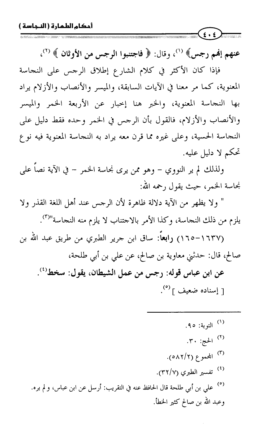 ولذلك لم ير النووي - وهو ممن يرى نجاسة الخمر - في الآية نصاً على نجاسة الخمر، حيث يقول رحمه الله:
