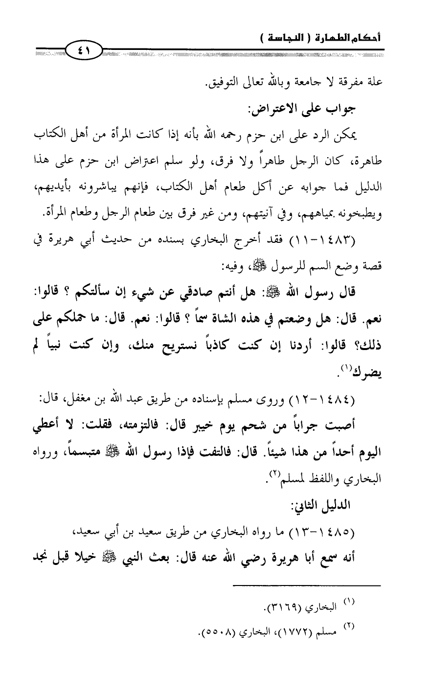 (١٤٨٣ - ١١) فقد أخرج البخاري بسنده من حديث أبي هريرة في قصة وضع السم للرسول - صلى الله عليه وسلم -، وفيه: