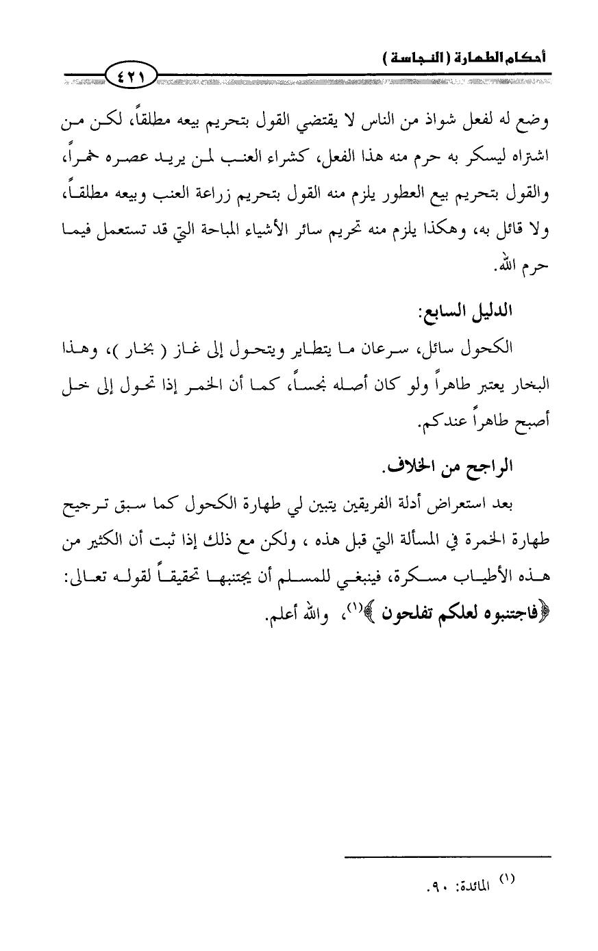 بعد استعراض أدلة الفريقين يتبين لي طهارة الكحول كما سبق ترجيح طهارة الخمرة في المسألة التي قبل هذه، ولكن مع ذلك إذا ثبت أن الكثير من هذه الأطياب مسكرة، فينبغي للمسلم أن يجتنبها تحقيقاً لقوله تعالى: {فاجتنبوه لعلكم تفلحون} (¬١)، والله أعلم.
