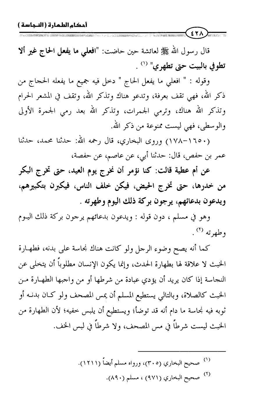 قال رسول الله - صلى الله عليه وسلم - لعائشة حين حاضت: "افعلي ما يفعل الحاج غير ألا تطوفي بالبيت حتى تطهري" (¬١).