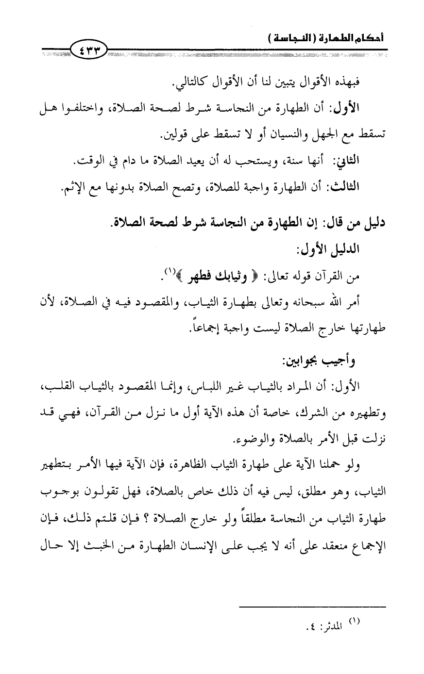 الأول: أن الطهارة من النجاسة شرط لصحة الصلاة، واختلفوا هل تسقط مع الجهل والنسيان أو لا تسقط على قولين.