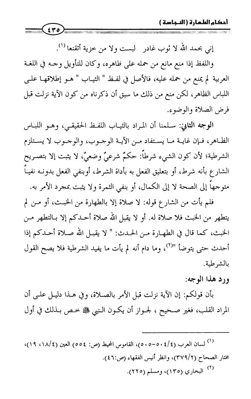 واللفظ إذا منع مانع من حمله على ظاهره، وكان للتأويل وجه في اللغة العربية لم يمنع من حمله عليه، فالأصل في لفظ " الثياب " هو إطلاقها على اللباس الظاهر، لكن منع من ذلك ما سبق أن ذكرناه من كون الآية نزلت قبل فرض الصلاة والوضوء.