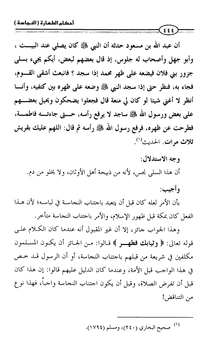أن عبد الله بن مسعود حدثه أن النبي - صلى الله عليه وسلم - كان يصلي عند البيت، وأبو جهل وأصحاب له جلوس، إذ قال بعضهم لبعض، أيكم يجيء بسلى جزور بني فلان فيضعه على ظهر محمد إذا سجد؟ فانبعث أشقى القوم، فجاء به، فنظر حتى إذا سجد النبي - صلى الله عليه وسلم - وضعه على ظهره بين كتفيه، وأنا أنظر لا أغني شيئا لو كان لي منعة قال فجعلوا يضحكون ويحيل بعضهم على بعض ورسول الله - صلى الله عليه وسلم - ساجد لا يرفع رأسه، حتى جاءته فاطمة، فطرحت عن ظهره، فرفع رسول الله - صلى الله عليه وسلم - رأسه ثم قال: اللهم عليك بقريش ثلاث مرات. الحديث (¬١).