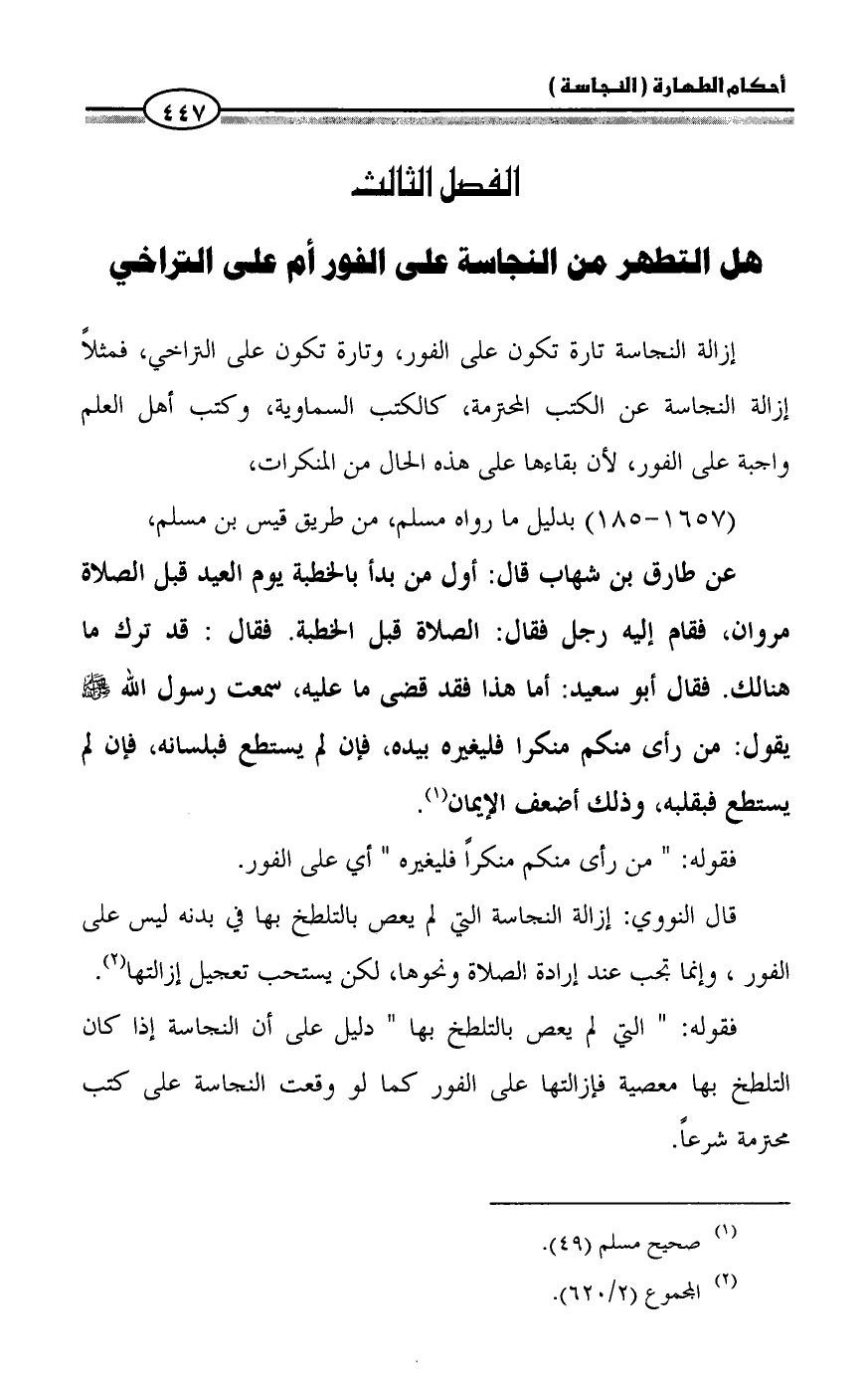 هل التطهر من النجاسة على الفور أم على التراخي