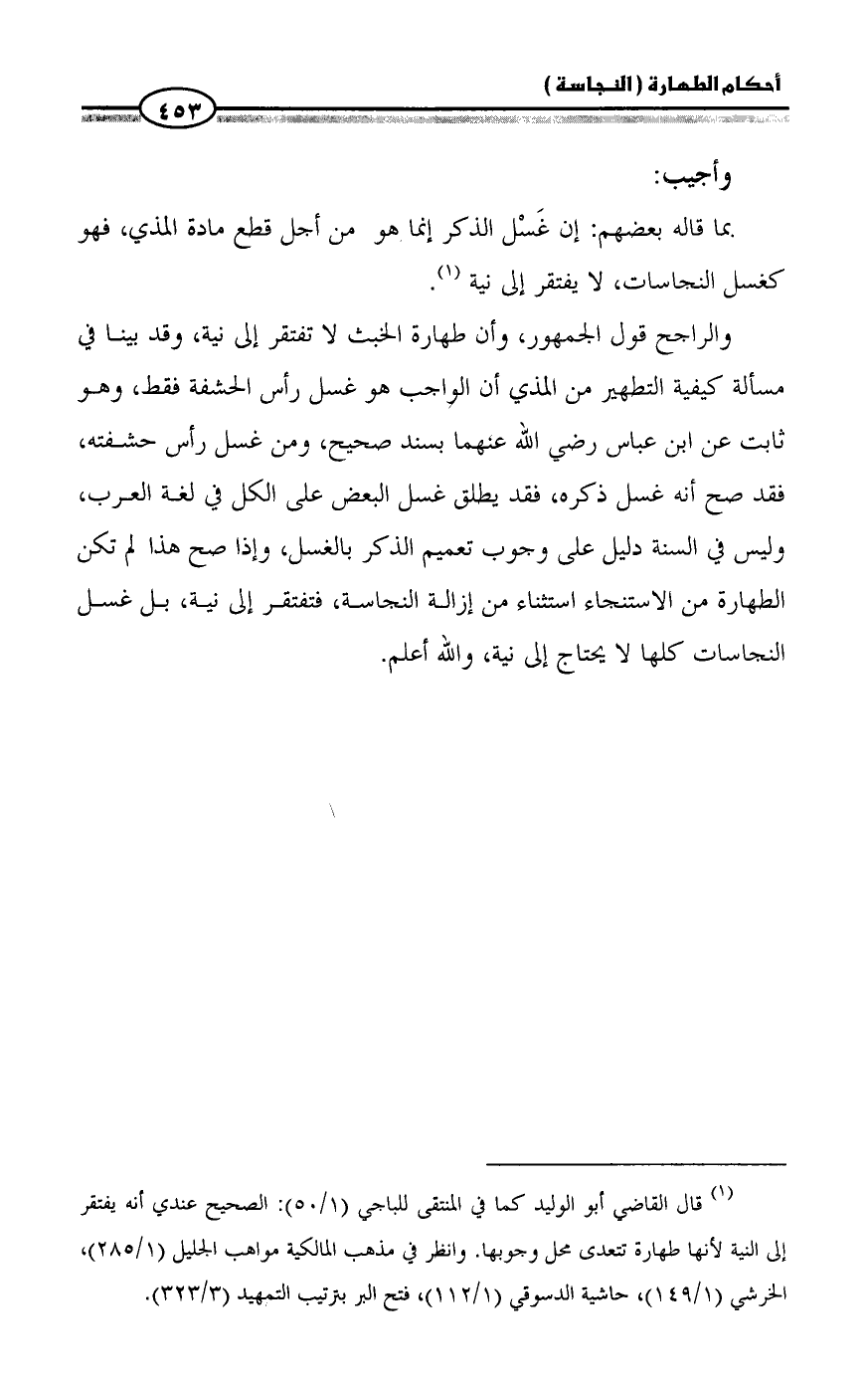 والراجح قول الجمهور، وأن طهارة الخبث لا تفتقر إلى نية، وقد بينا في مسألة كيفية التطهير من المذي أن الواجب هو غسل رأس الحشفة فقط، وهو ثابت عن ابن عباس رضي الله عنهما بسند صحيح، ومن غسل رأس حشفته، فقد صح أنه غسل ذكره، فقد يطلق غسل البعض على الكل في لغة العرب، وليس في السنة دليل على وجوب تعميم الذكر بالغسل، وإذا صح هذا لم تكن الطهارة من الاستنجاء استثناء من إزالة النجاسة، فتفتقر إلى نية، بل غسل النجاسات كلها لا يحتاج إلى نية، والله أعلم.