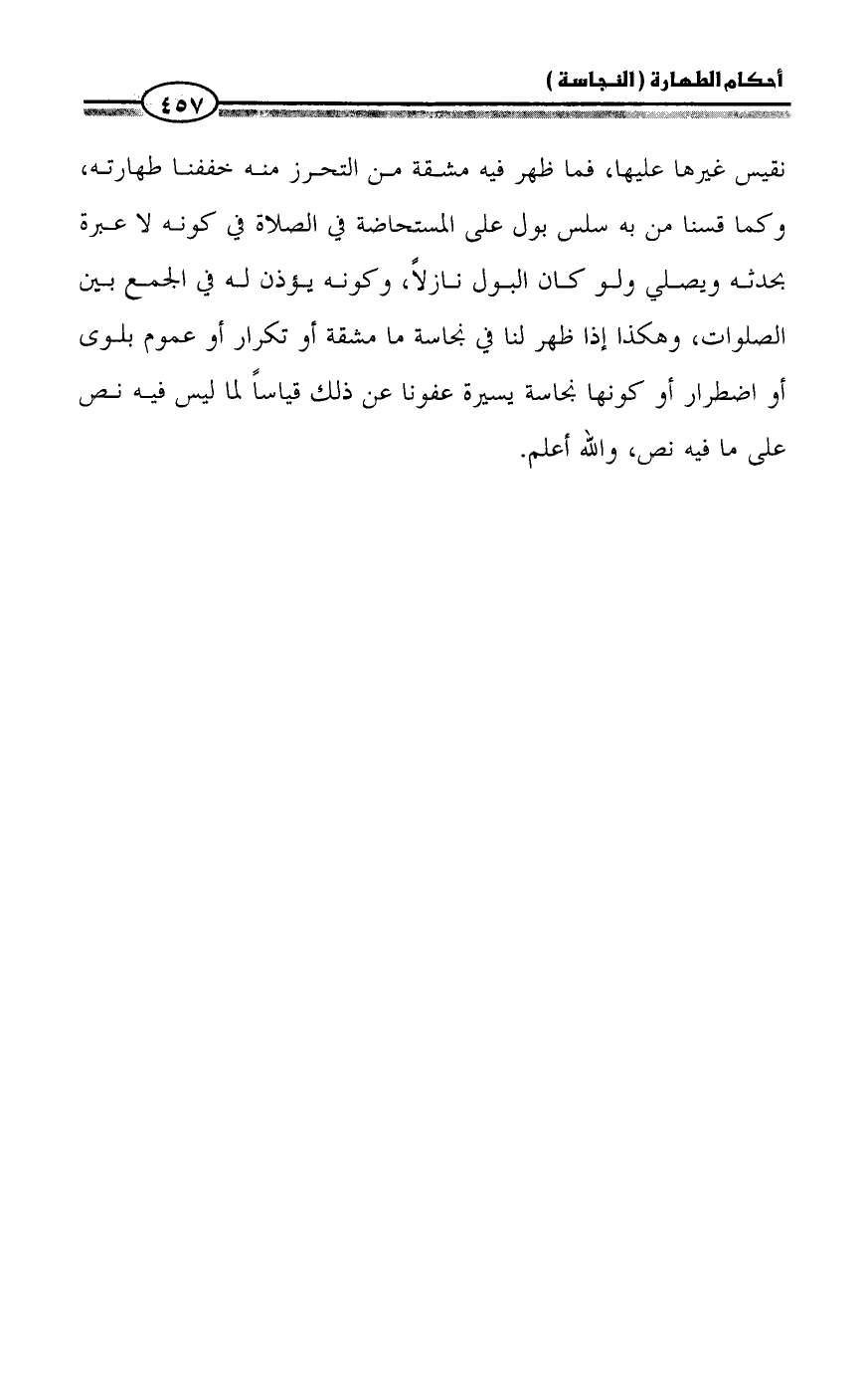 نقيس غيرها عليها، فما ظهر فيه مشقة من التحرز منه خففنا طهارته، وكما قسنا من به سلس بول على المستحاضة في الصلاة في كونه لا عبرة بحدثه ويصلي ولو كان البول نازلاً، وكونه يؤذن له في الجمع بين الصلوات، وهكذا إذا ظهر لنا في نجاسة ما مشقة أو تكرار أو عموم بلوى أو اضطرار أو كونها نجاسة يسيرة عفونا عن ذلك قياساً لما ليس فيه نص على ما فيه نص، والله أعلم.