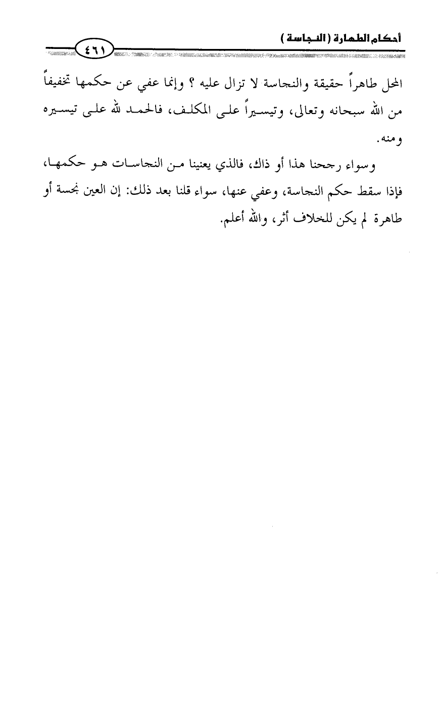 وسواء رجحنا هذا أو ذاك، فالذي يعنينا من النجاسات هو حكمها، فإذا سقط حكم النجاسة، وعفي عنها، سواء قلنا بعد ذلك: إن العين نجسة أو طاهرة لم يكن للخلاف أثر، والله أعلم.