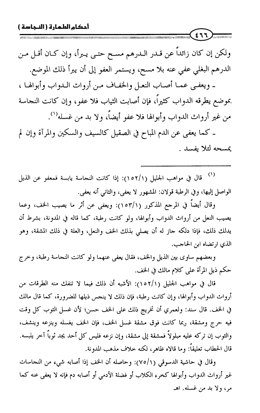وقال أيضاً في المرجع المذكور (١/ ١٥٣): ويعفى عن أثر ما يصيب الخف، وعما يصيب النعل من أرواث الدواب وأبوالها، ولو كانت رطبة، كما قاله في المدونة، بشرط أن يدلك ذلك، فإذا دلكه جاز له أن يصلي بذلك الخف والنعل، والعلة في ذلك المشقة، وهو الذي ارتضاه ابن الحاجب.