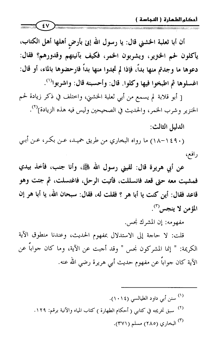 قلت: لا حاجة إلى الاستدلال بمفهوم الحديث، وعندنا منطوق الآية الكريمة: " إنما المشركون نجس " وقد أجبت عن الآية، وما كان جواباً عن الآية كان جواباً عن مفهوم حديث أبي هريرة رضي الله عنه.