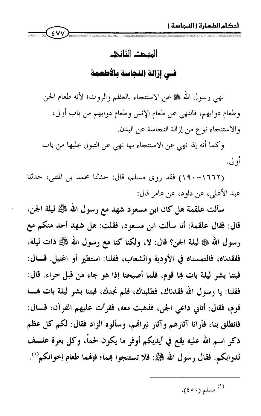 سألت علقمة هل كان ابن مسعود شهد مع رسول الله - صلى الله عليه وسلم - ليلة الجن، قال: فقال علقمة: أنا سألت ابن مسعود، فقلت: هل شهد أحد منكم مع رسول الله - صلى الله عليه وسلم - ليلة الجن؟ قال: لا، ولكنا كنا مع رسول الله - صلى الله عليه وسلم - ذات ليلة، ففقدناه، فالتمسناه في الأودية والشعاب، فقلنا: استطير أو اغتيل. قال: فبتنا بشر ليلة بات بها قوم، فلما أصبحنا إذا هو جاء من قبل حراء. قال: فقلنا: يا رسول الله فقدناك، فطلبناك، فلم نجدك، فبتنا بشر ليلة بات بها قوم، فقال: أتاني داعي الجن، فذهبت معه، فقرأت عليهم القرآن، قال: فانطلق بنا، فأرانا آثارهم وآثار نيرانهم، وسألوه الزاد فقال: لكم كل عظم ذكر اسم الله عليه يقع في أيديكم أوفر ما يكون لحماً، وكل بعرة علف لدوابكم. فقال رسول الله - صلى الله عليه وسلم -: فلا تستنجوا بهما؛ فإنهما طعام إخوانكم (¬١).