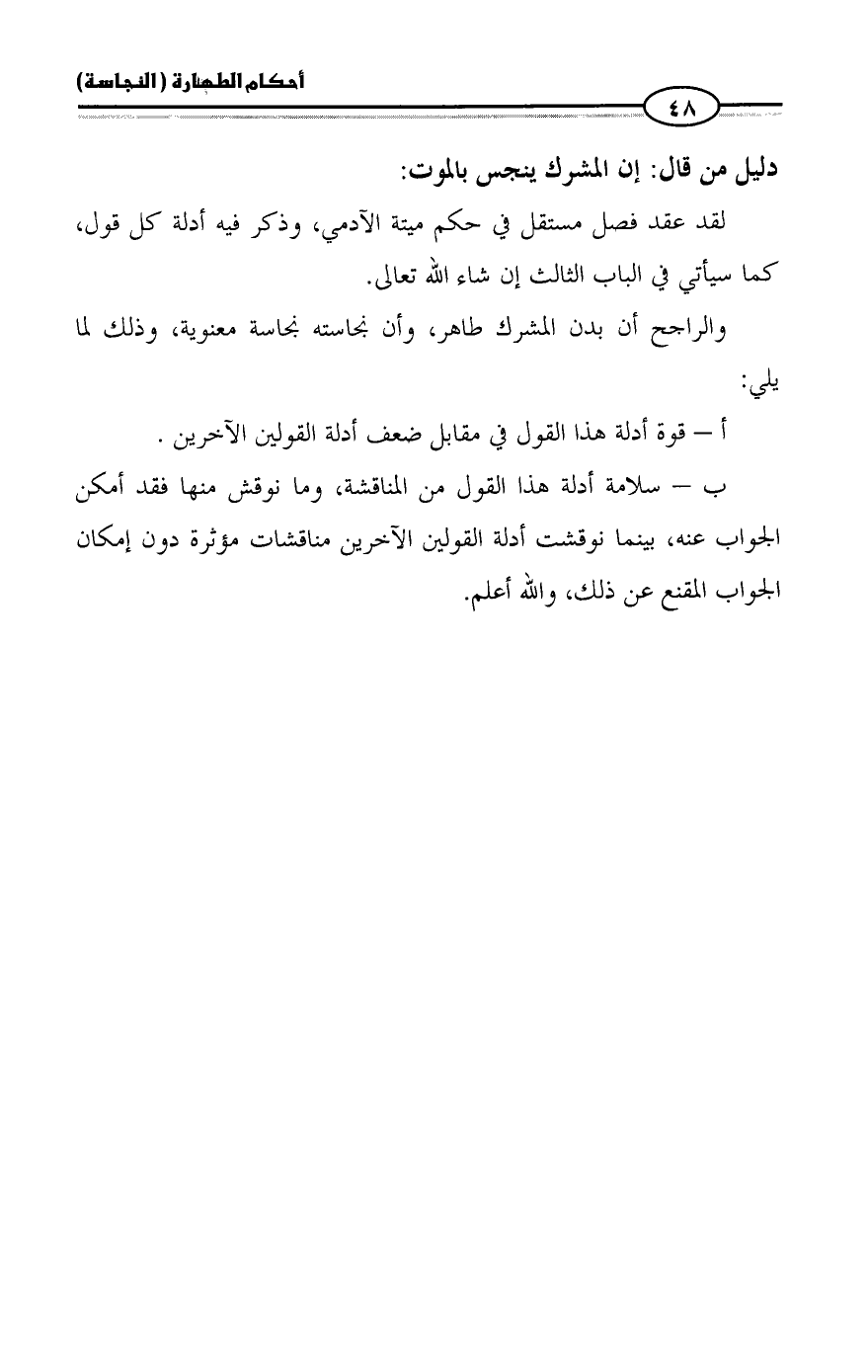 والراجح أن بدن المشرك طاهر، وأن نجاسته نجاسة معنوية، وذلك لما يلي: