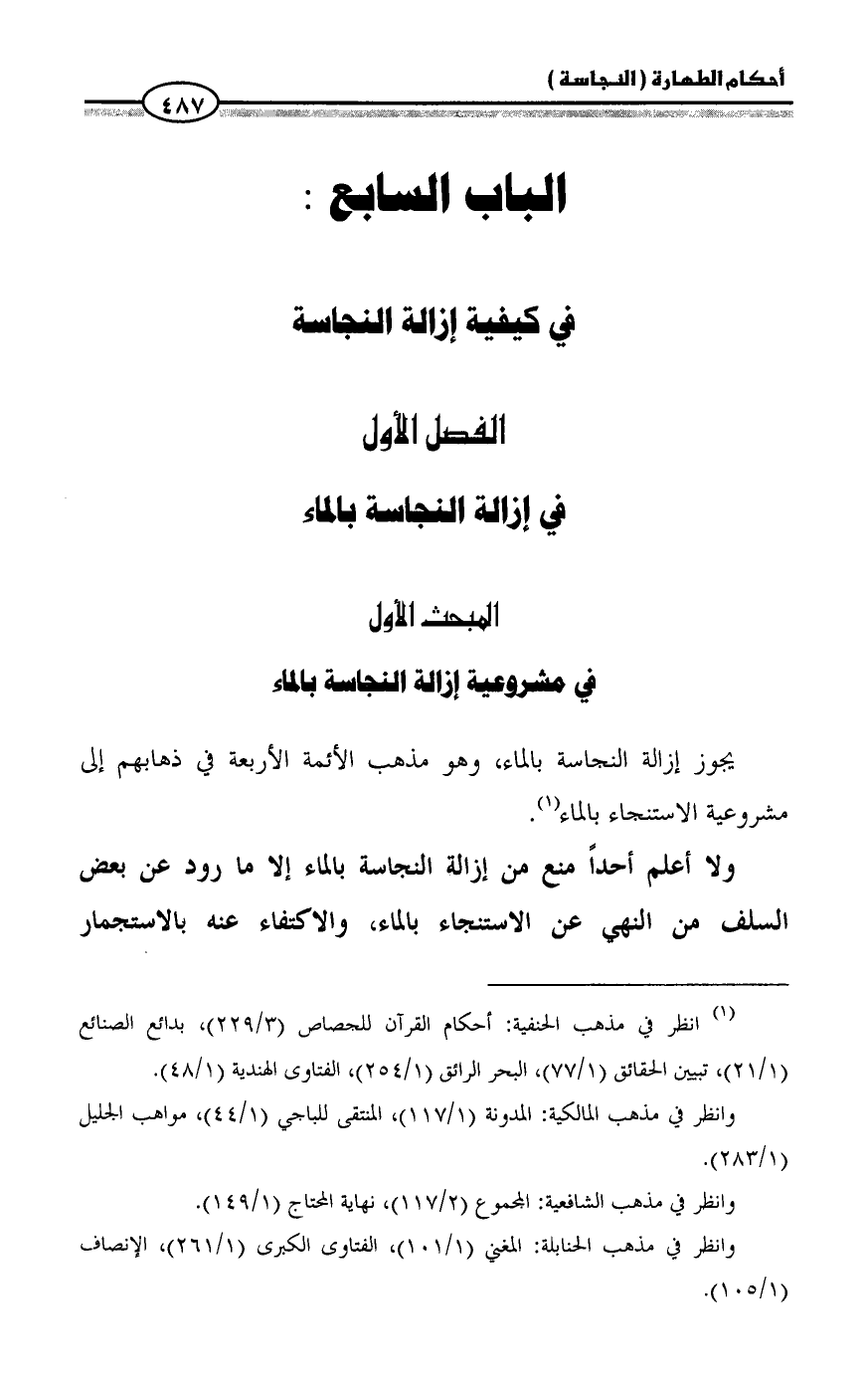 ولا أعلم أحداً منع من إزالة النجاسة بالماء إلا ما رود عن بعض السلف من النهي عن الاستنجاء بالماء، والاكتفاء عنه بالاستجمار