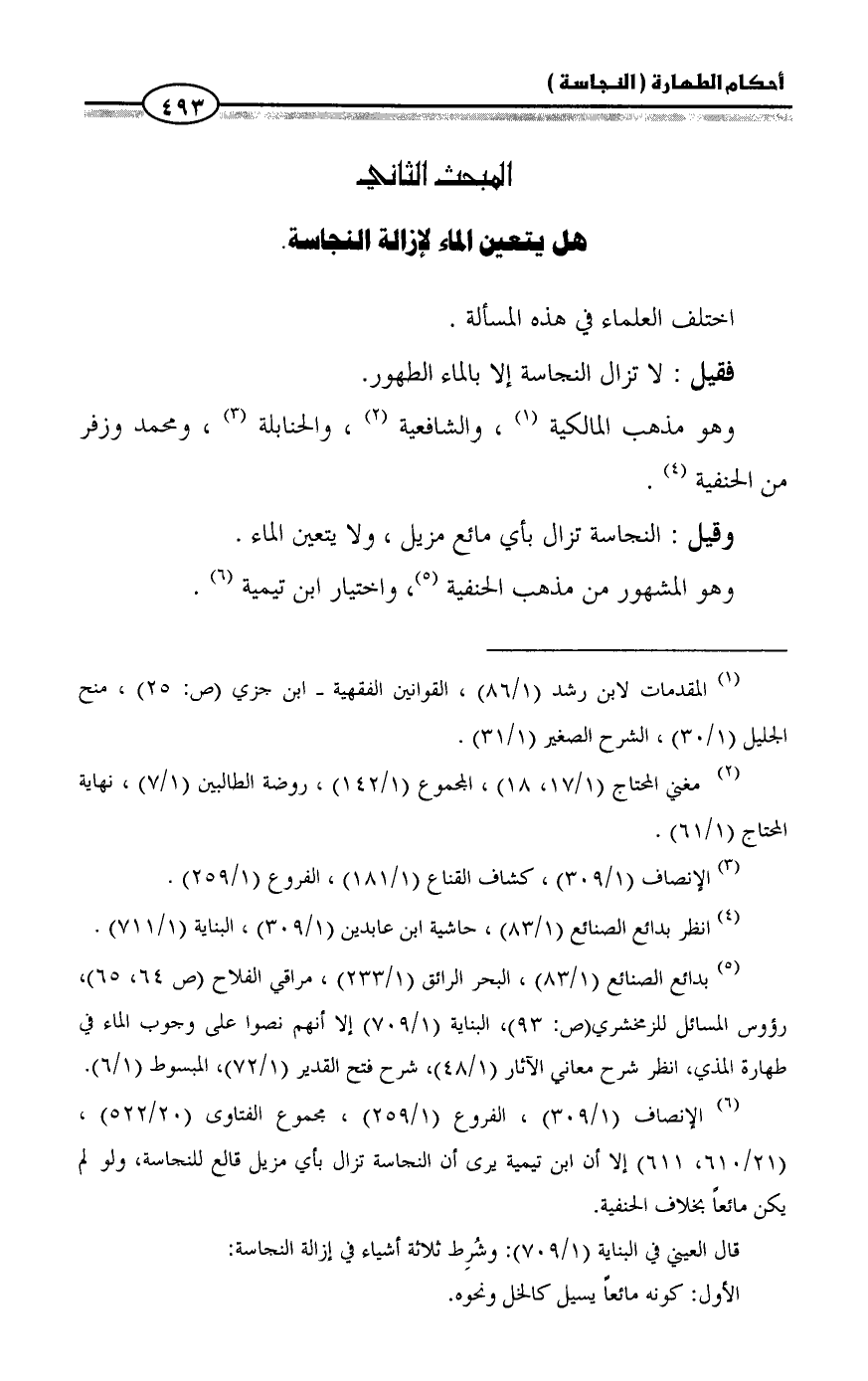 (¬٦) الإنصاف (١/ ٣٠٩)، الفروع (١/ ٢٥٩)، مجموع الفتاوى (٢٠/ ٥٢٢)، (٢١/ ٦١٠، ٦١١) إلا أن ابن تيمية يرى أن النجاسة تزال بأي مزيل قالع للنجاسة، ولو لم يكن مائعاً بخلاف الحنفية.