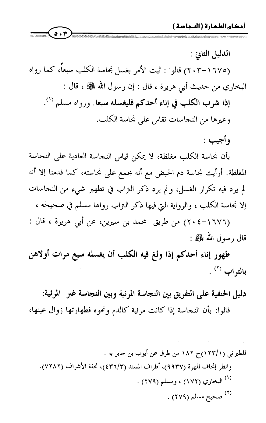 (١٦٧٥ - ٢٠٣) قالوا: ثبت الأمر بغسل نجاسة الكلب سبعاً، كما رواه البخاري من حديث أبي هريرة، قال: إن رسول الله - صلى الله عليه وسلم -، قال: