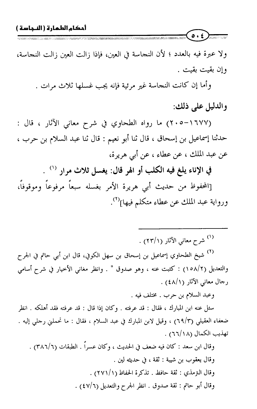 (١٦٧٧ - ٢٠٥) ما رواه الطحاوي في شرح معاني الآثار، قال: حدثنا إسماعيل بن إسحاق، قال ثنا أبو نعيم: قال ثنا عبد السلام بن حرب، عن عبد الملك، عن عطاء، عن أبي هريرة،