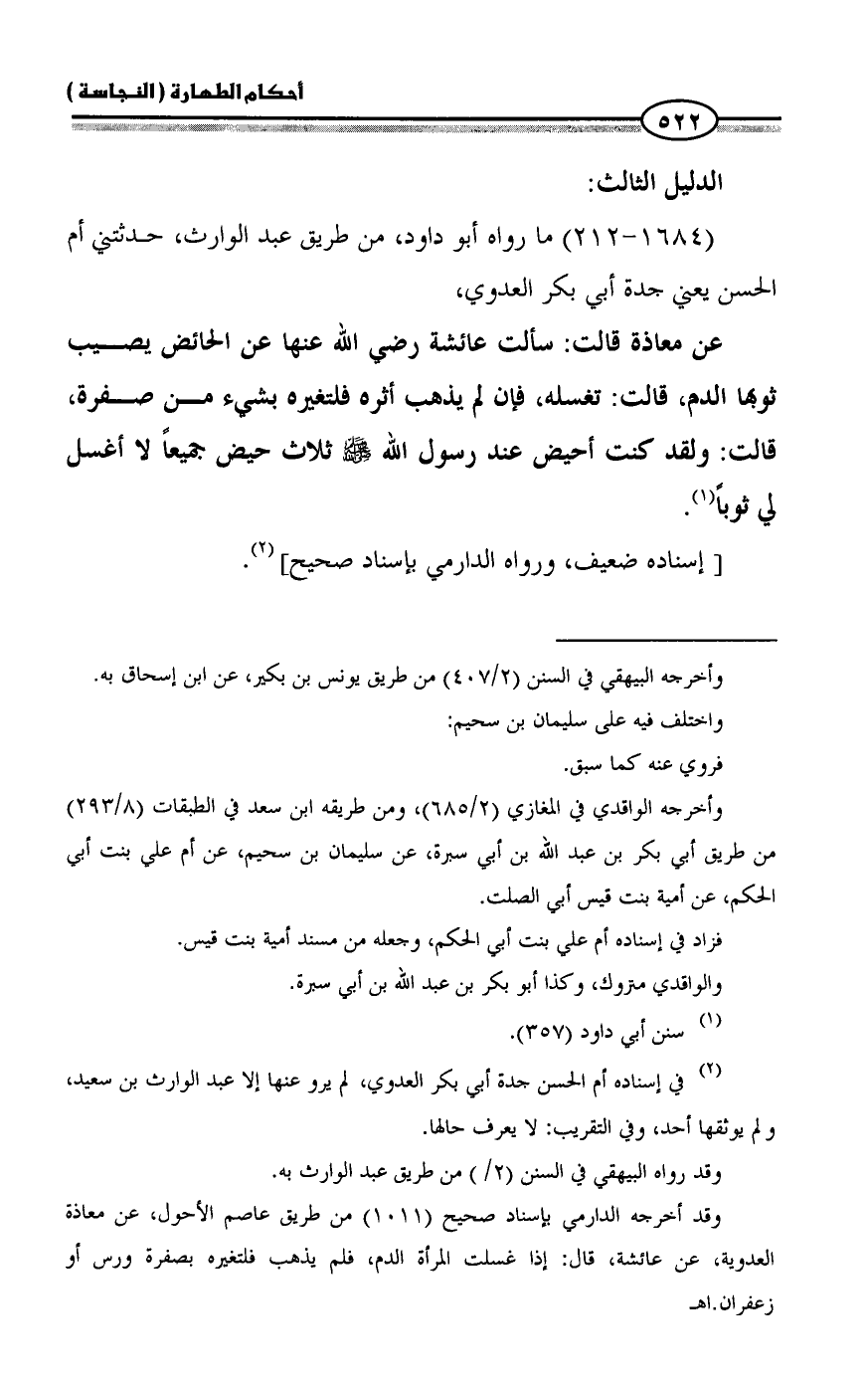 عن معاذة قالت: سألت عائشة رضي الله عنها عن الحائض يصيب ثوبها الدم، قالت: تغسله، فإن لم يذهب أثره فلتغيره بشيء من صفرة، قالت: ولقد كنت أحيض عند رسول الله - صلى الله عليه وسلم - ثلاث حيض جميعاً لا أغسل لي ثوباً (¬١).