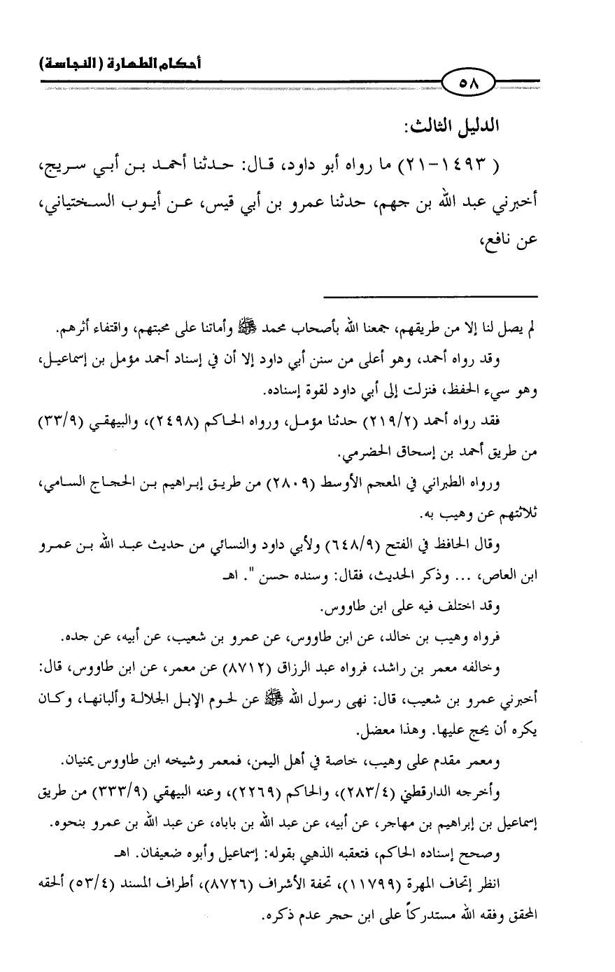 (١٤٩٣ - ٢١) ما رواه أبو داود، قال: حدثنا أحمد بن أبي سريج، أخبرني عبد الله بن جهم، حدثنا عمرو بن أبي قيس، عن أيوب السختياني، عن نافع،
