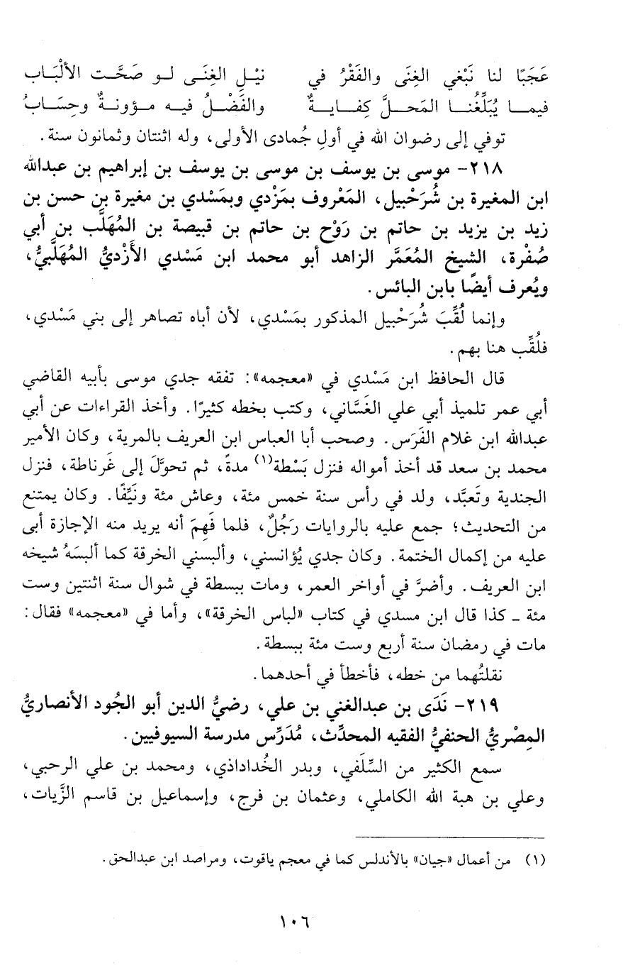 218 - موسى بْنُ يوسف بْن موسى بْن يوسف بْن إِبْرَاهِيم بْن عَبْد اللَّه بْن المغيرة بْن شُرَحبيل، المعروف بمزْدي وبمسْدي بْن مغيرة بْن حسن بْن زيد بْن يزيد بْن حاتم بْن رَوْح بْن حَاتِمِ بْن قُبيصة بْن المهلَّب بْن أَبِي صُفْرة، الشيخ المُعَمَّر الزّاهد أَبُو مُحَمَّد بْن مسْدي الأَزْديّ المُهَلّبيّ، ويعرف أيضًا بابن البائس. [المتوفى: 604 هـ]