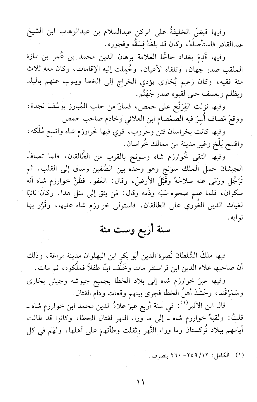 قَالَ ابن الأثير: في سنة أربع عبرَ علاءُ الدّين مُحَمَّد ابن خُوارزم شاه - قلتُ: ولَقَبَهُ خُوارزم شاه - إِلى ما وراء النّهر لقتال الخطا، وكانوا قد طالت أيّامهم ببلاد تُركستان وما وراء النَّهر وثقُلَت وطْأتهم عَلَى أهلها، ولهم في كلّ -[12]- بلد نائب، وهم يسكنون الخركاوات عَلَى عادتهم، وكان مُقامهم بنواحي كاشغر وأوزْكَنْد وبَلاسَاغُون. وكان سلطان سمرقند وبُخارى مَقْهُورًا معهم، فكاتبَ علاءَ الدّين وطلبَ منه النَّجدةَ عَلَى أن يَحْمل إِلَيْهِ ما يَحْمله إِلى الخطا ويُريح الإسلام منهم.