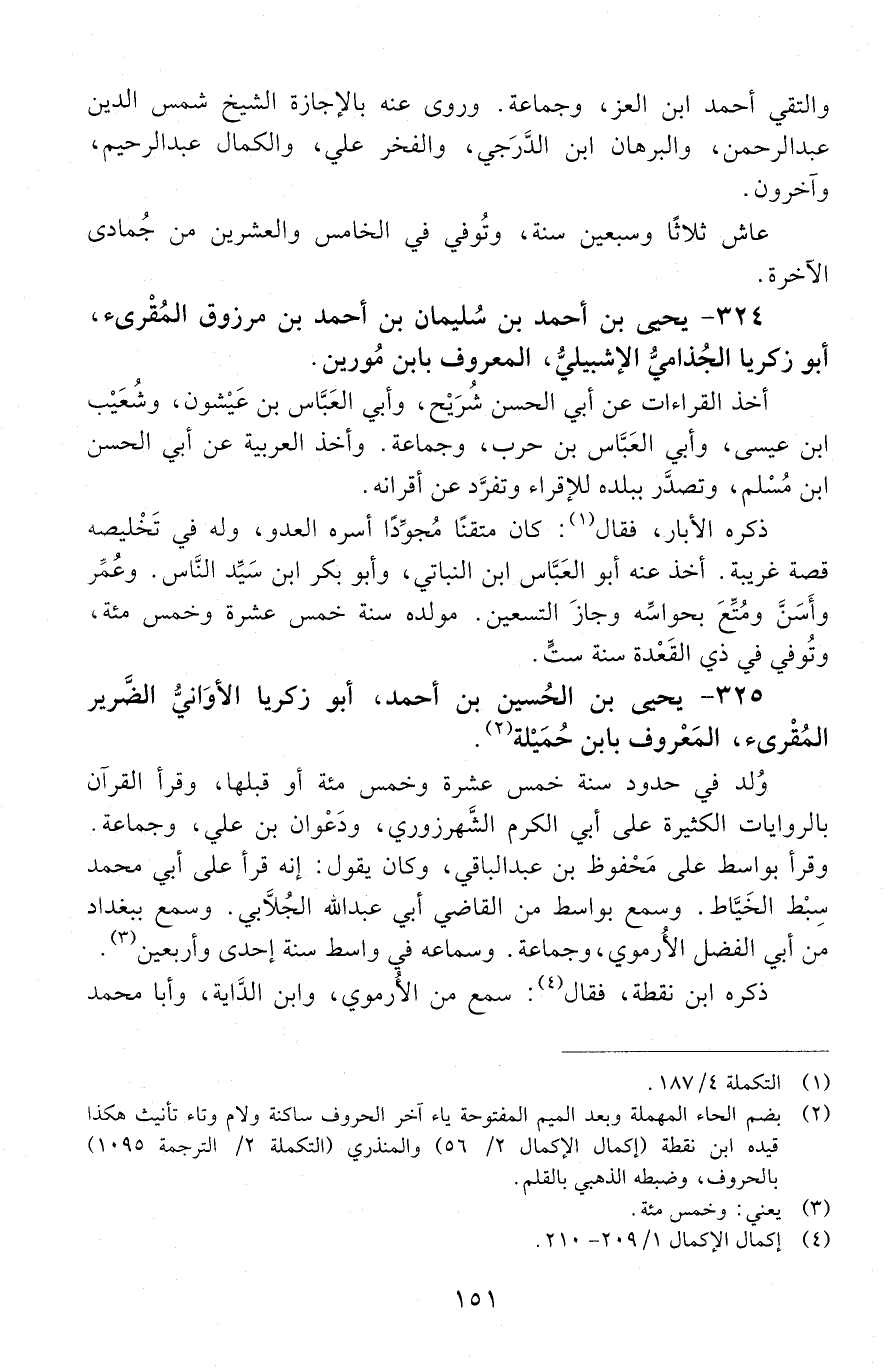 325 - يَحْيَى بْن الحُسَيْن بْن أَحْمَد، أَبُو زكريّا الأوانيّ الضّرير، المقرئ، المعروف بابن حُمَيْلة. [المتوفى: 606 هـ]