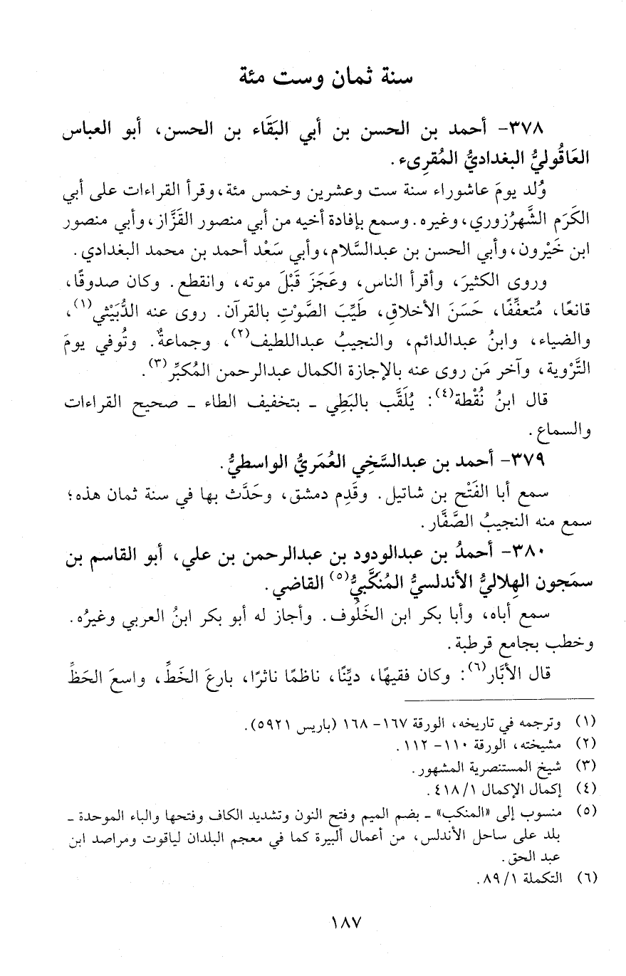 378 - أَحْمَد بْن الْحَسَن بْن أَبِي البقاء بْن الْحَسَن، أَبُو العَبَّاس العَاقُوليّ البغداديّ المقرئ. [المتوفى: 608 هـ]
