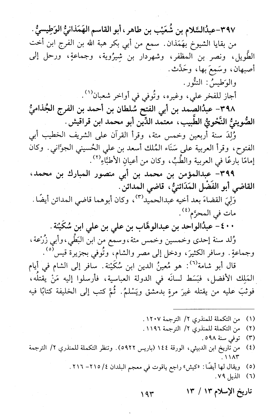 397 - عَبْدُ السّلام بْن شعيب بْن طاهر، أَبُو القَاسِم الهَمَذَانيّ، الوطيسيّ. [المتوفى: 608 هـ]