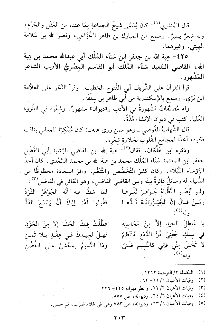 425 - هبة الله بن جعفر ابن سناء المُلك أَبِي عَبْد الله مُحَمَّد بْن هبة الله، القاضي السّعيد سناء المُلك أَبُو القَاسِم المصريّ الأديب [المتوفى: 608 هـ]