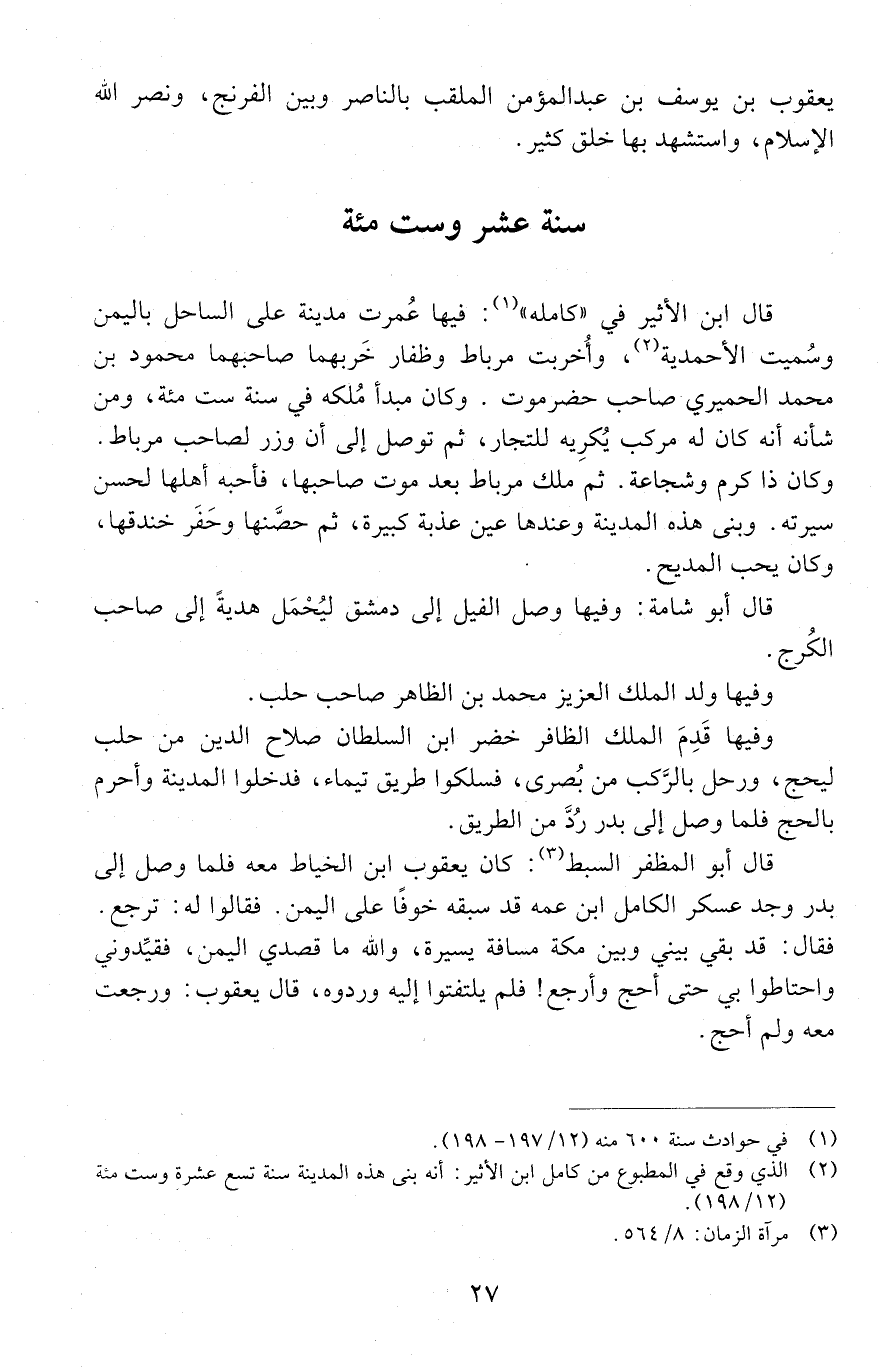 وفيها قدم الملك الظافر خضر ابن السلطان صلاح الدّين من حلب ليحجّ، ورحل بالرَّكْب من بُصْرَى، فسلكوا طريق تَيْماء، فدخلوا المدينة وأحرم بالحجّ، فلمّا وصل إِلى بدر رُدَّ من الطّريق.