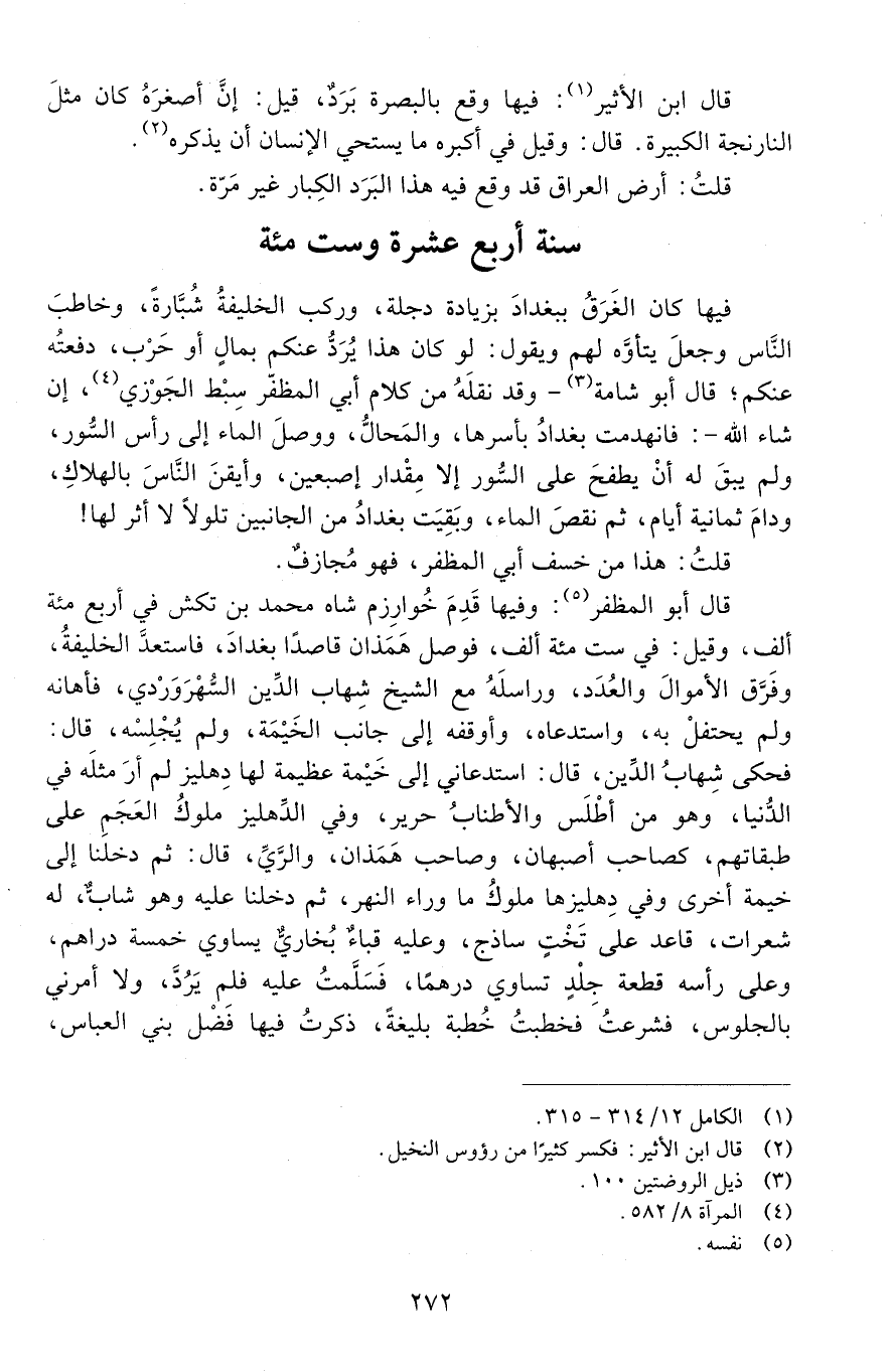فيها كَانَ الغَرَقُ ببغدادَ بزيادة دِجلة، وركب الخليفة شُبّارةً، وخاطبَ النَّاس، وجعلَ يتأوَه لهم وَيَقُولُ: لو كَانَ هَذَا يُرَدُّ عنكم بمالٍ أَوْ حَرْب، دفعتهُ عنكم؛ قَالَ أَبُو شامة - وقد نقلَهُ من كلام أَبِي المُظَفَّر سِبْط الْجَوْزيّ، إن شاء اللَّه -: فانهدمت بغدادُ بأسرها، والمَحالّ، ووصلَ الماء إلى رأس السُّور، ولم يبقَ لَهُ أن يطفحَ عَلَى السُّور إِلَّا مقدار إصبعين، وأيقن الناسُ بالهلاك، ودام ثمانية أيام، ثُمَّ نقصَ الماء، وبقيت بغداد من الجانبين تُلُولًا لا أثر لها!.