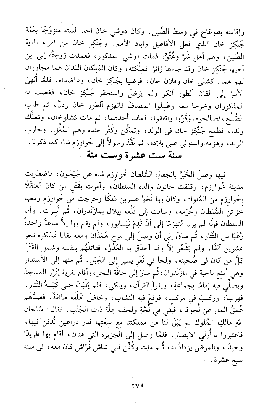فيها وصلَ الخبر بانجفال السلطان خُوَارِزْم شاه عن جيحون، فاضطربت مدينة خُوَارِزْم، وقلقت خاتون والدة السلطان، وأمرت بقَتْل من كَانَ معتقلًا بخوارزم من المُلوك، وَكَانَ بها نحو عشرين مَلِكًا، وخرجت من خُوَارِزْم ومعها خزائن السلطان وحُرَمه، وساقت إلى قلعة إيلال بمازنْدران، ثُمَّ أُسِرت. وأما السلطان فَإِنَّهُ لم يزل مُنهزمًا إلى أنْ قدِمَ نَيْسَابُور، ولم يُقم بها إِلَّا ساعةً واحدة رُعْبًا من التّتار، ثُمَّ ساق إلى أنْ وصلَ إلى مرْج هَمَذَان ومعه بقايا عسْكَره نحو عشرين ألفًا، ولم يشعر إِلَّا وقد أحدَق بِهِ العدوّ، فقاتلَهُم بنفسه، وشمل القَتْل كلّ من كَانَ في صحبته، ولجأ في نَفَرٍ يسير إلى الجبل، ثُمَّ منها إلى الاستدار وَهِيَ أمنع ناحية في مازندران، ثُمَّ سارَ إلى حافة البحر، وأقام بقرية يُنَوِّر المسجدَ ويصلِّي فيه إمامًا بجماعة، ويقرأ القرآن، ويبكي، فلم يلبث حَتَّى كَبَسه التّتار، فهربَ، ورِكبَ في مركبٍ، فوقع فيه النشاب، وخاضَ خلفه طائفةٌ، فصدَّهُم عمق الماء عن لحوقه، فبقي في لجةٍ ولحِقتْه عِلَّة ذات الْجَنْب، فَقَالَ: سبحان اللَّه مالك الملوك لم يبق لنا من مملكتنا مَعَ سعتها قدْر ذراعين نُدفن فيها، فاعتبروا يا أُولي الْأبصار. فَلَمَّا وصل إلى الجزيرة التي هناك، أقام بها طريدًا وحيدًا، والمرض يزدادُ بِهِ، ثُمَّ مات وكُفّن في شاش فَراش كَانَ معه، في سنة سبع عشرة. -[280]-